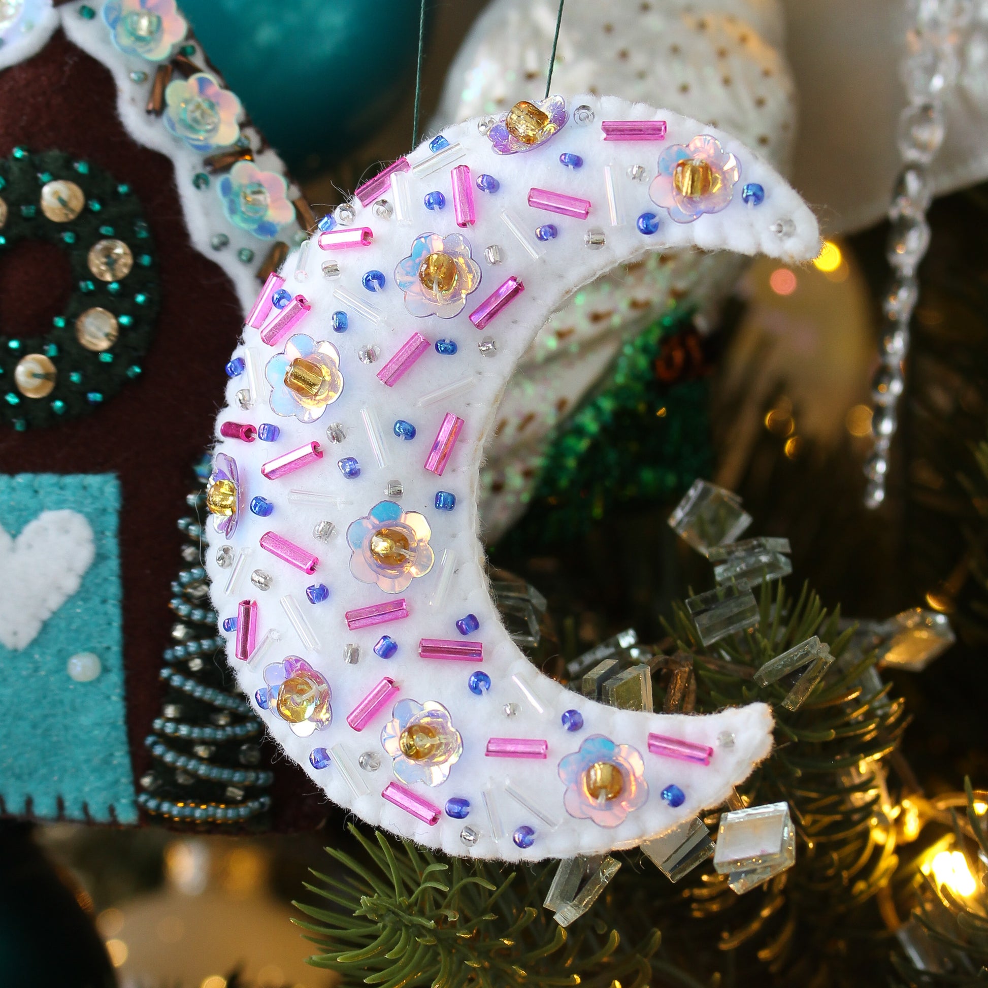White Crescent Moon Felt Ornament: Has a sprinkling of hand stitched, random bugle beads and seed beads for sparkle - shades of pink, purple, blue and silver.