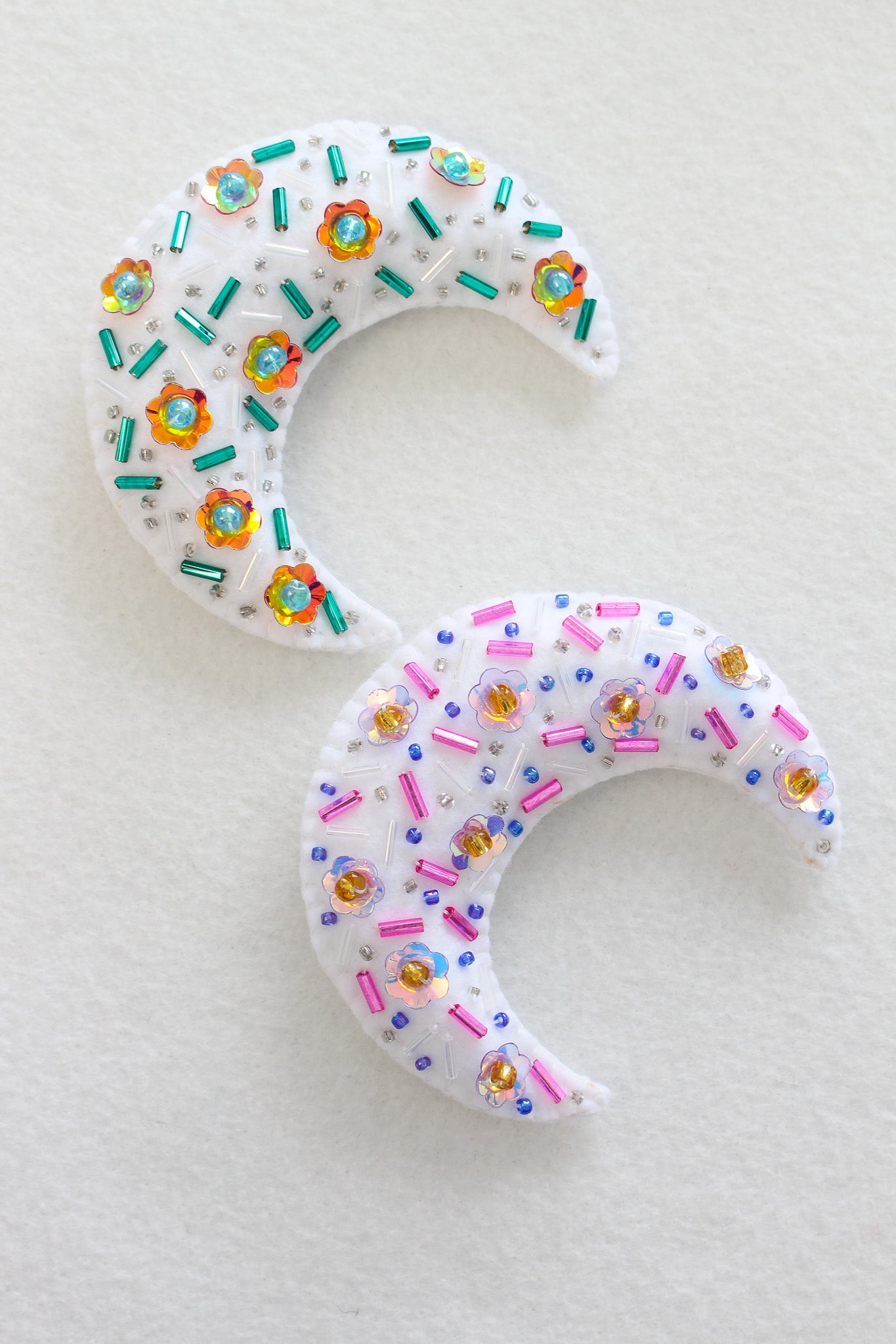 Handmade Felt Moon Ornament with Beading and Sequins: Pink + Purple OOAK