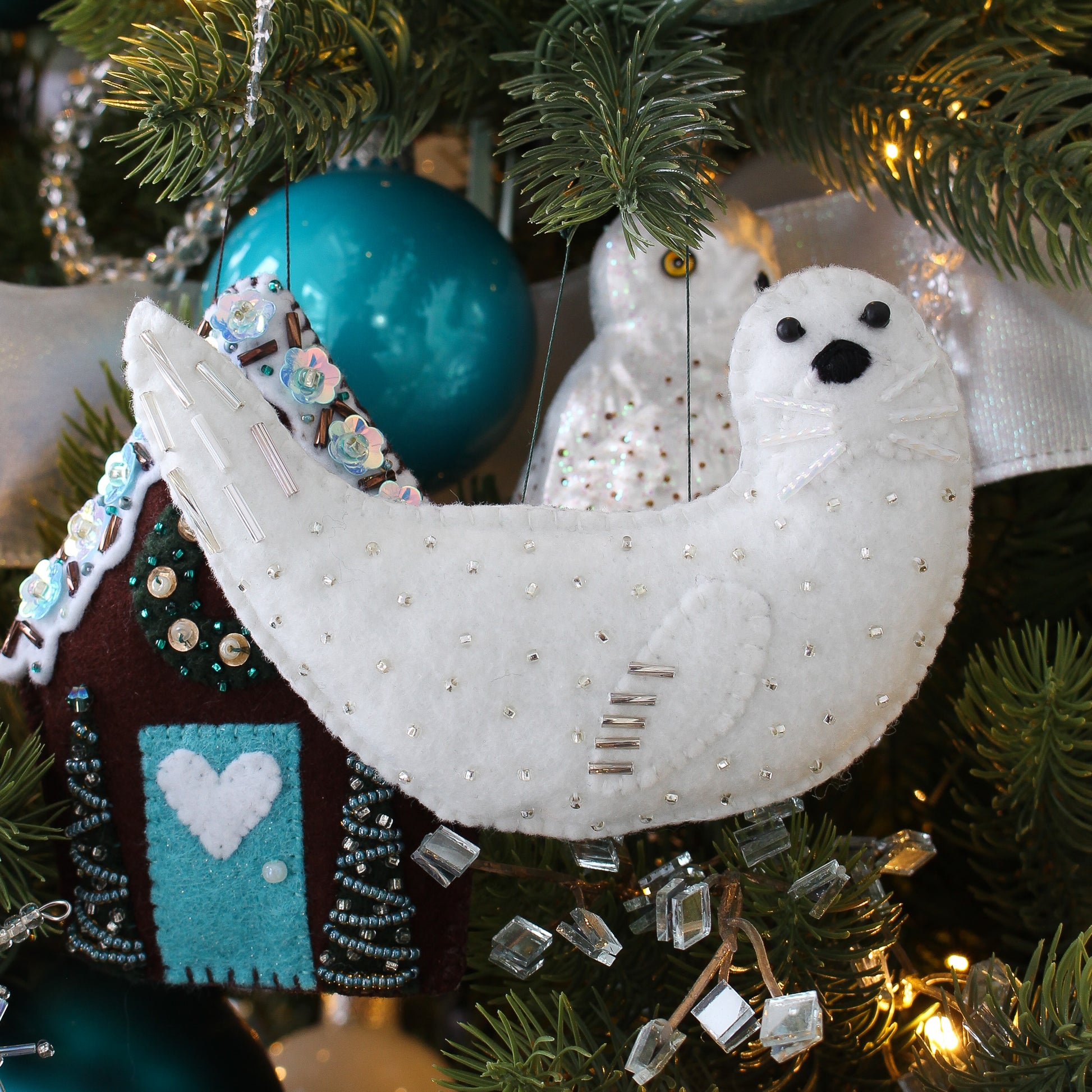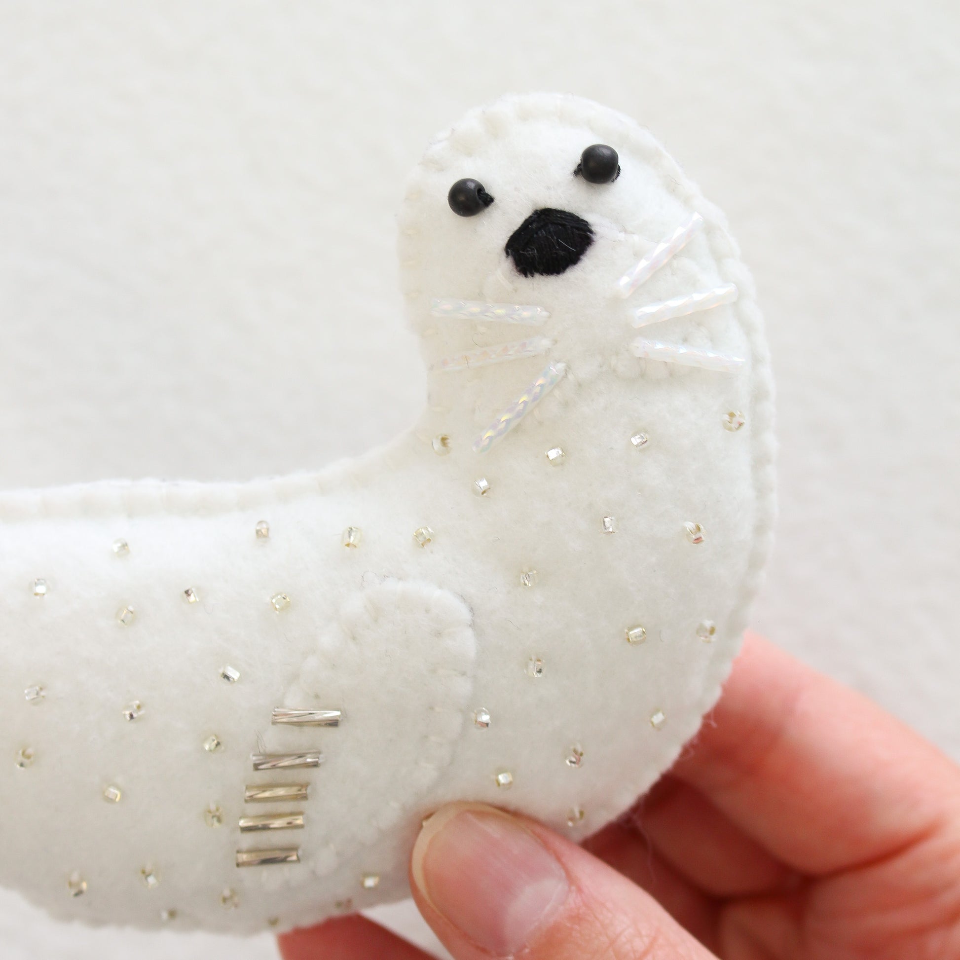 White Felt Seal Ornament: He has a sprinkling of hand stitched bugle beads on his flipper, seed beads on his back for snow, beads for eyes, bugle beads for whiskers and tail details, and a stitched on nose.