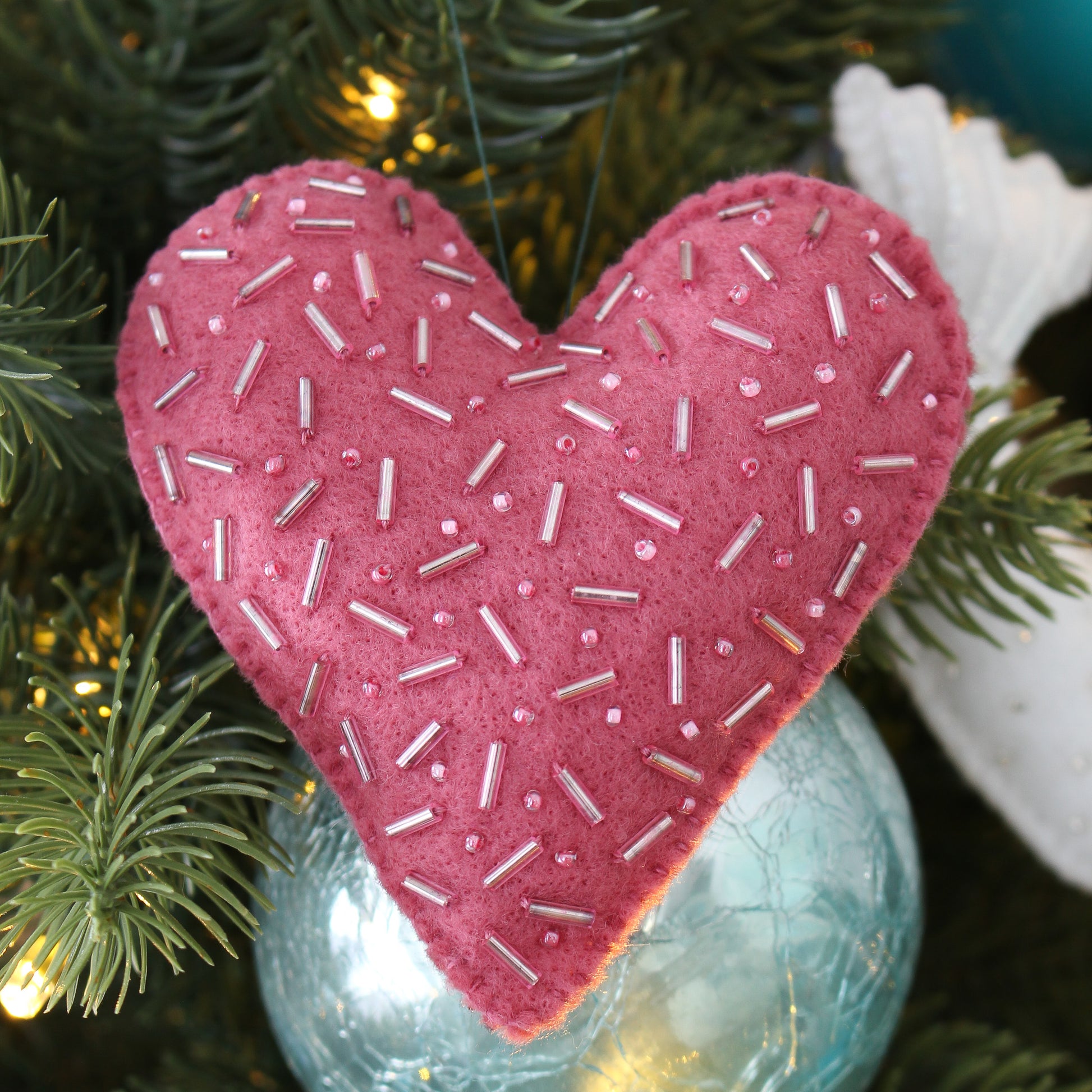 Pink Heart Felt Ornament: Has a sprinkling of hand stitched, random bugle beads and seed beads for sparkle.